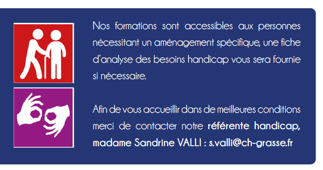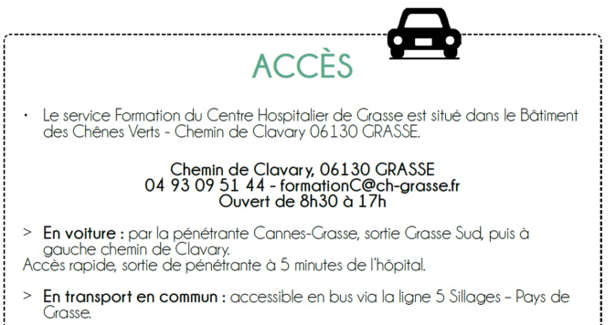 Conformément à la loi « Informatique et Libertés » du 6 janvier 1978 modifiée en 2004, vous bénéficiez d’un droit d’accès et de rectification aux informations qui vous concernent, que vous pouvez exercer en vous adressant à : formationC@ch-grasse.fr